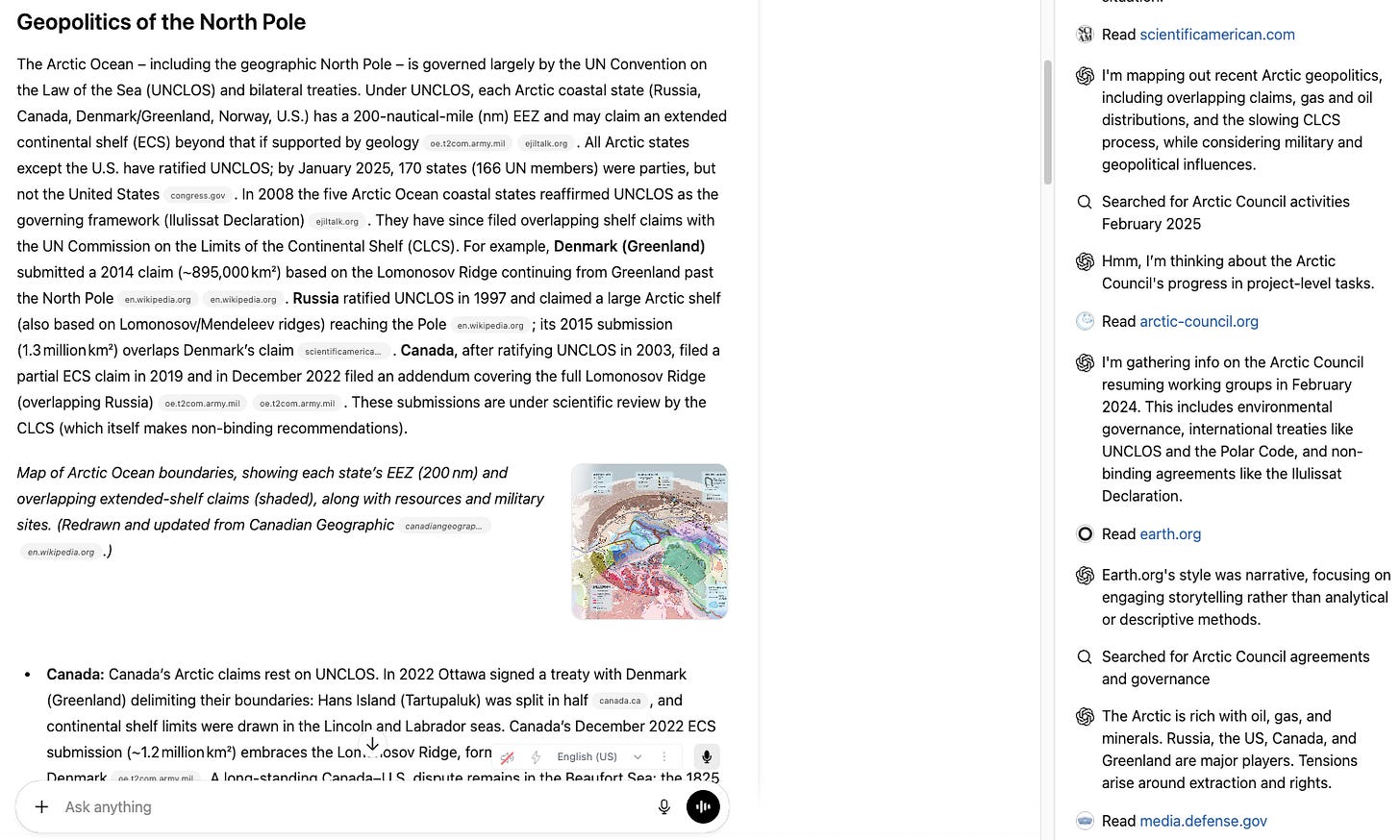 ChatGPT now has a Deep Research function, built into the chatbox, which offers more extensive web search and integration for answers. For an example, I asked it to “help me understand the geopolitics of the North pole.” It asked a good clarifying question in turn, which I addressed, then it worked for around six minutes. It opened a window on the right side of the screen, detailing the web sources it worked through, before finally posting a detailed answer in the main window: